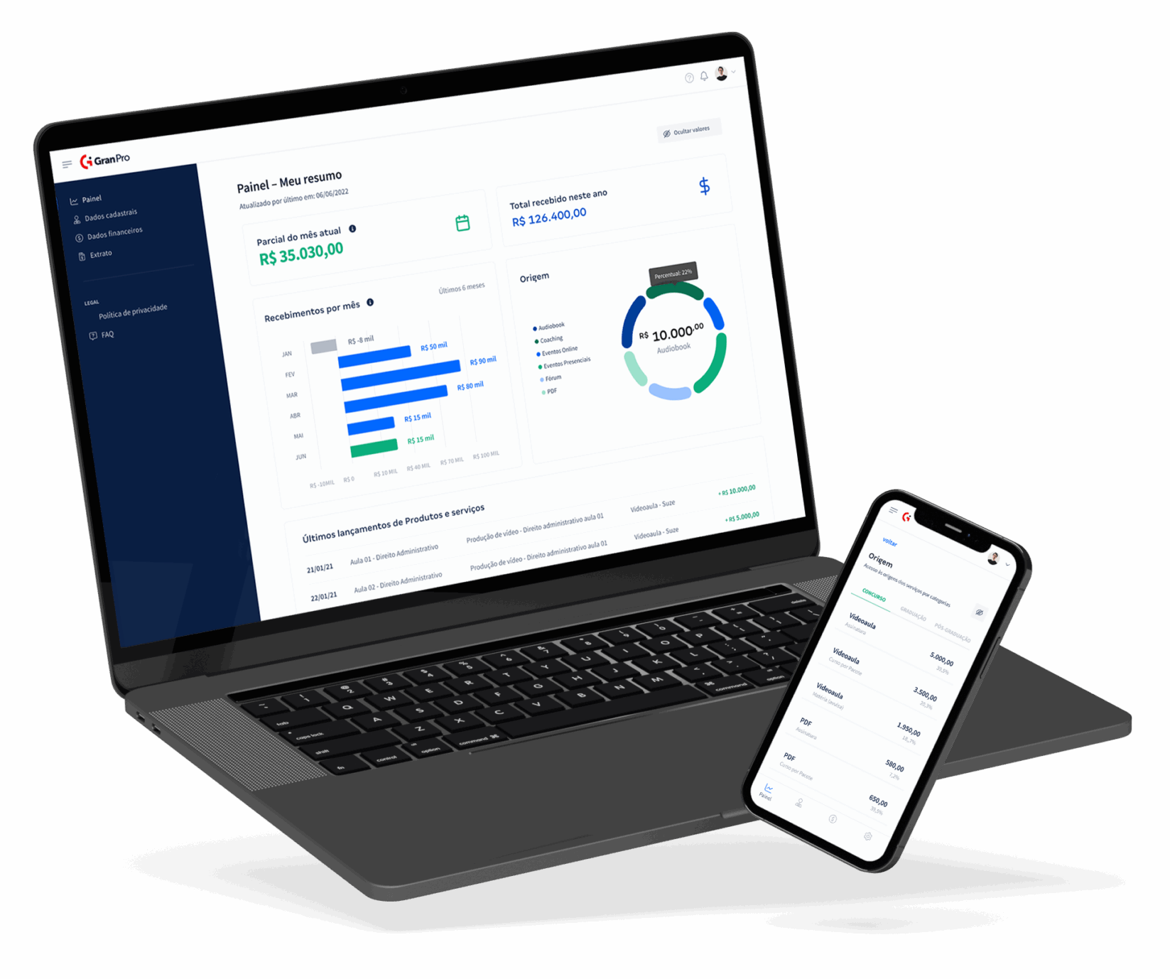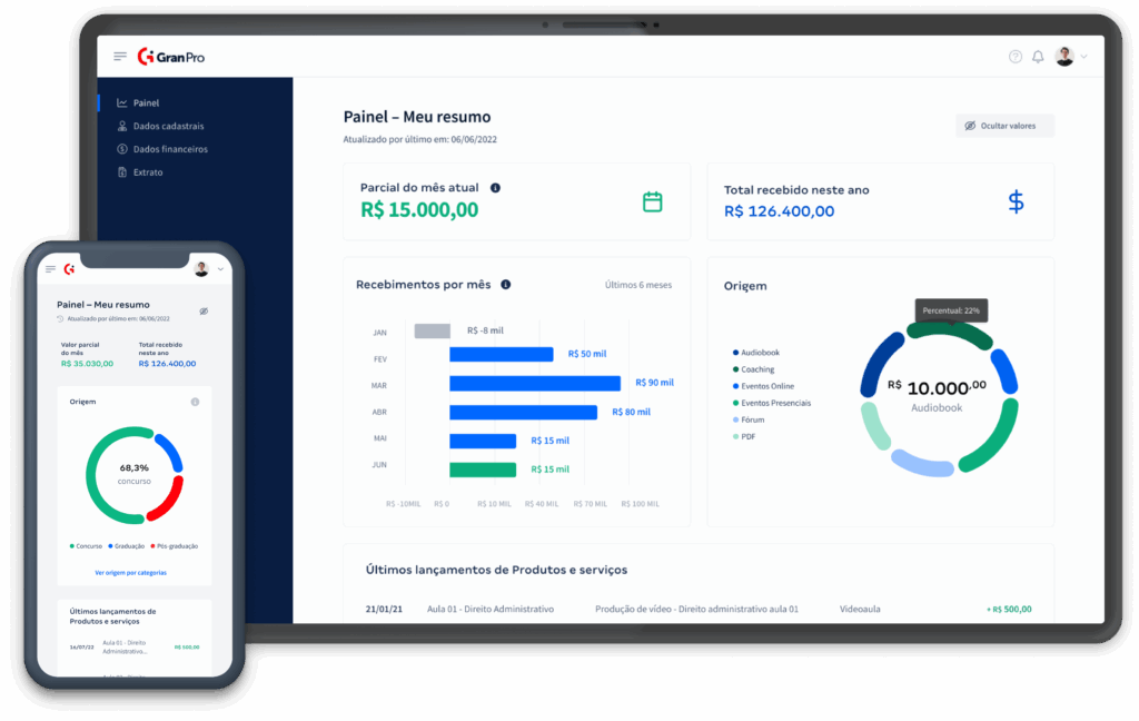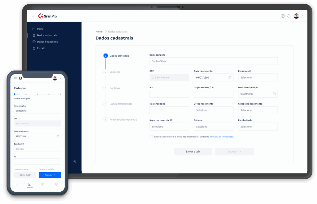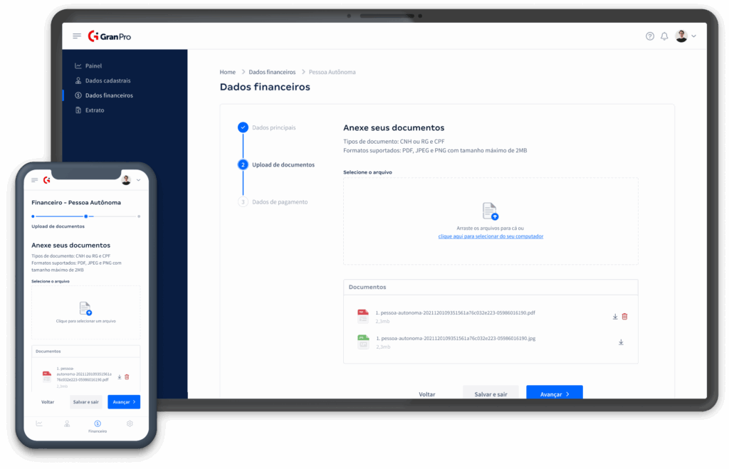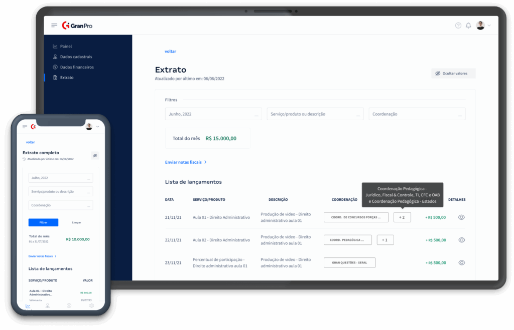 O Gran Pro foi a resposta. Uma plataforma intuitiva que centraliza a gestão financeira. Através dela, os profissionais podem cadastrar suas informações e acessar os extratos de pagamento mensais de forma simples e eficiente, eliminando a complexidade dos processos anteriores.